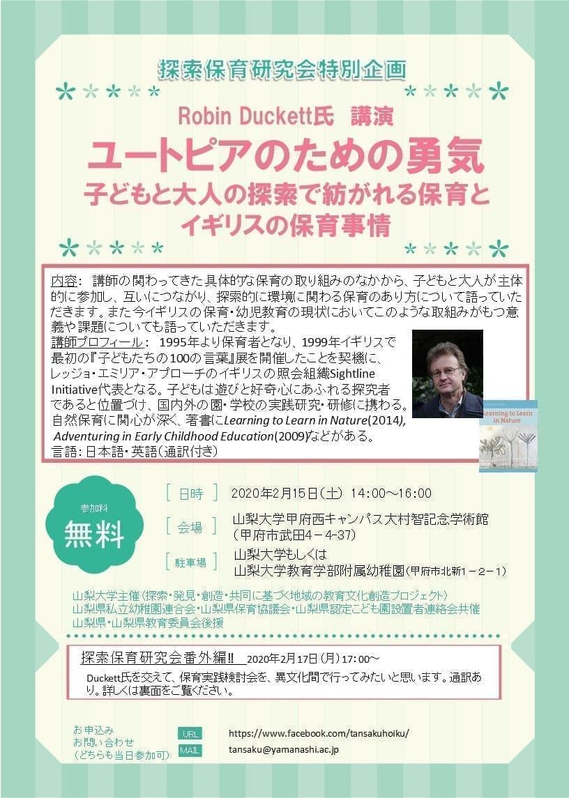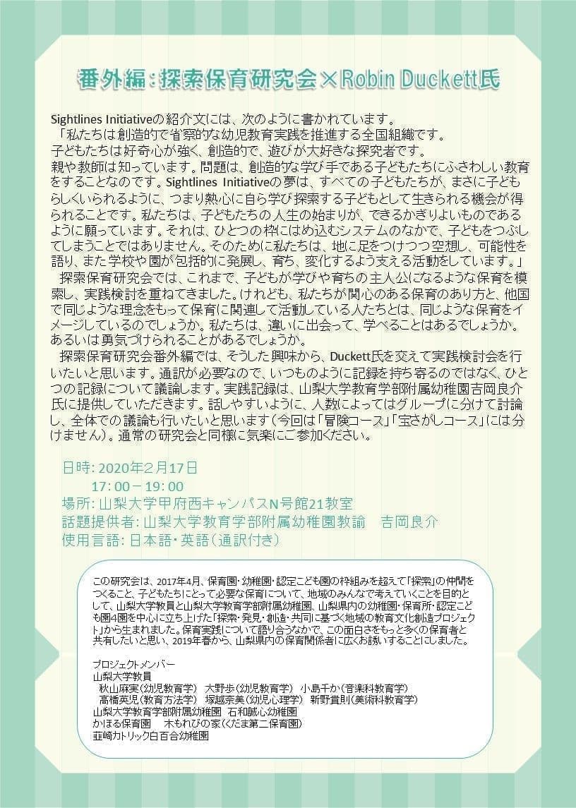 Duckett氏を交えて、保育実践検討会を、異文化間で行ってみたいと思います。通訳あり。詳しくは裏面をご覧ください。